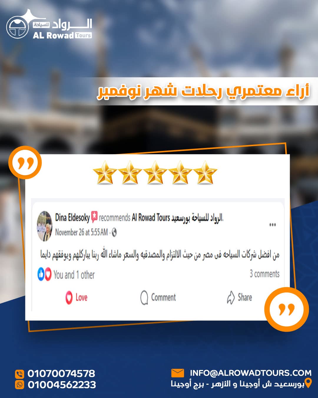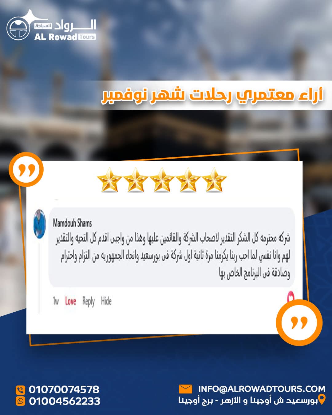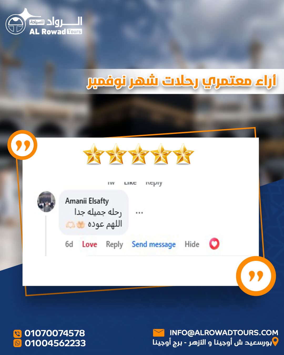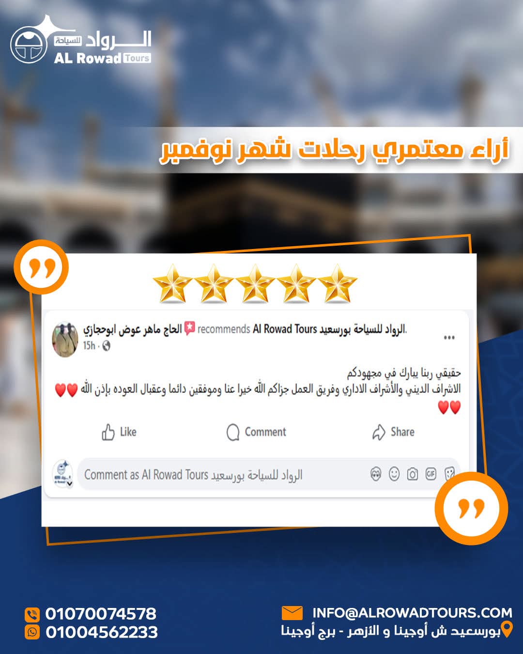 بعض اراء معتمرينا الكرام في رحلات شهر نوفمبر بنشارككم بعض الكلمات والدعوات الجميلة اللي قالها معتمرونا بعد ما عاشوا أياما مباركة بين مكة والمدينه